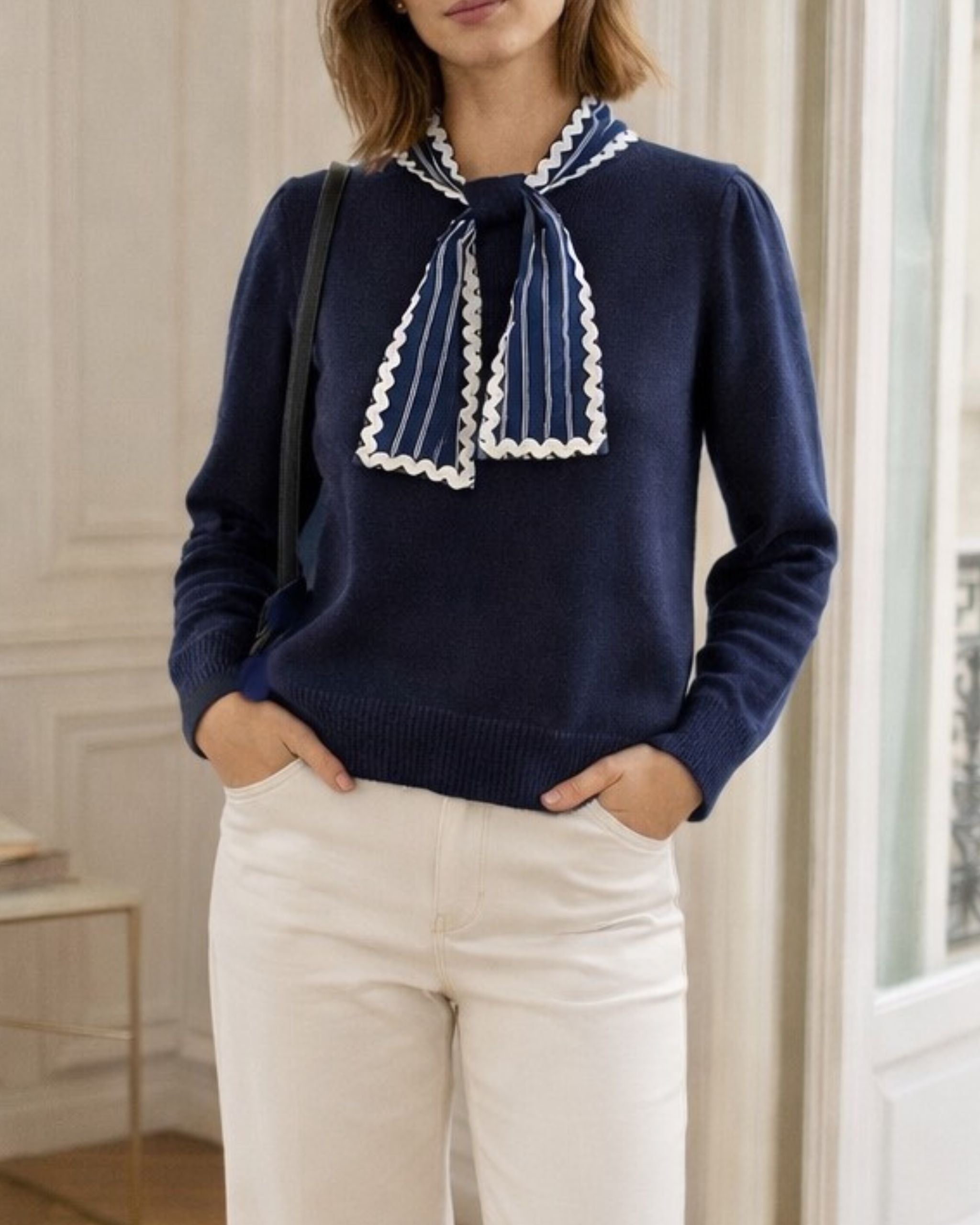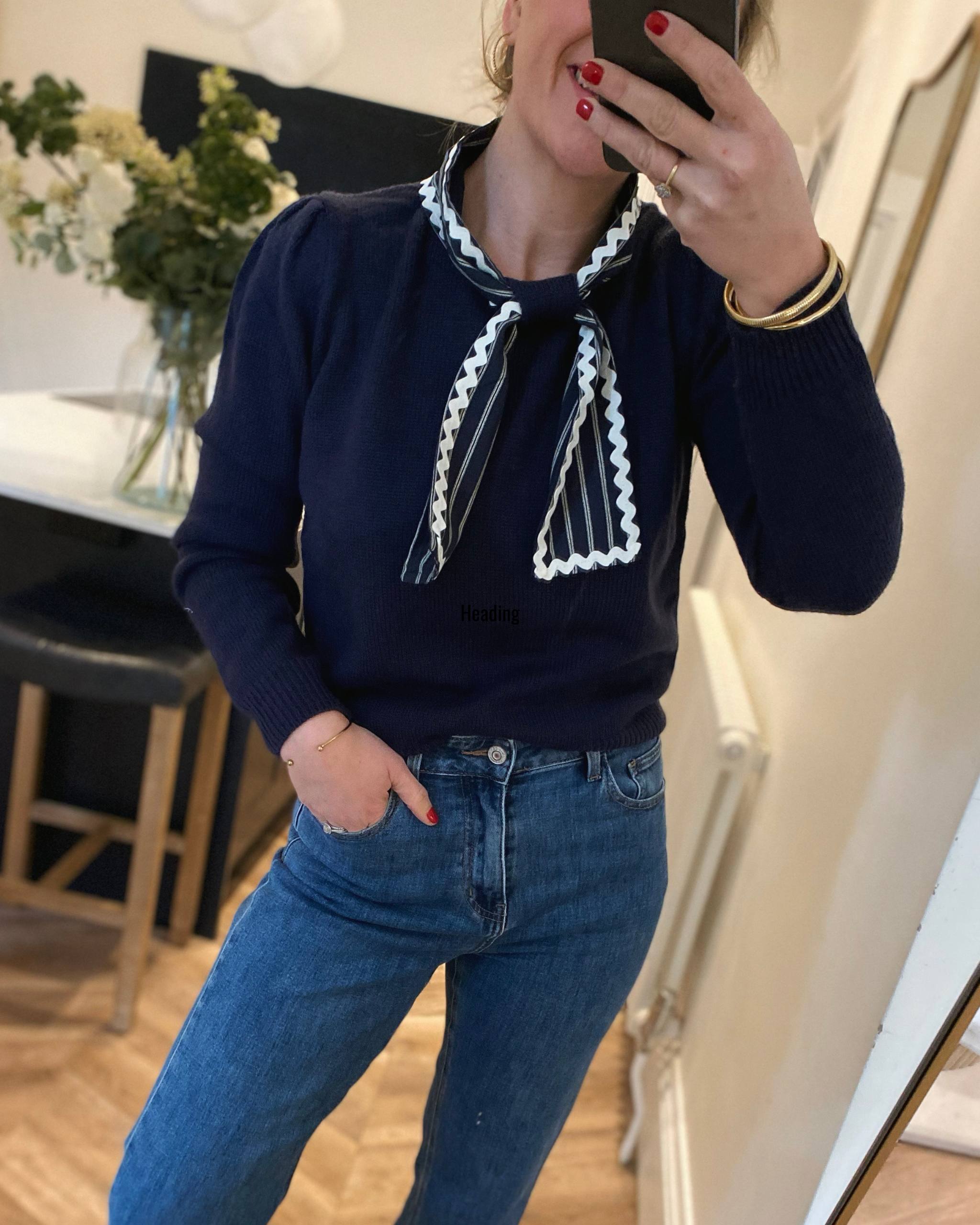 The Cece Top is a timeless piece with a subtle statement detail. Crafted in classic navy, it features a softly structured silhouette finished with an attached scarf-tie neckline with pinstripe and a white ricrac scalloped edge. Elegant yet easy to wear, The Cece brings a polished feel to everyday dressing. Style it with crisp white denim for a fresh, modern look, or pair it with tailored trousers for effortless Parisian sophistication.