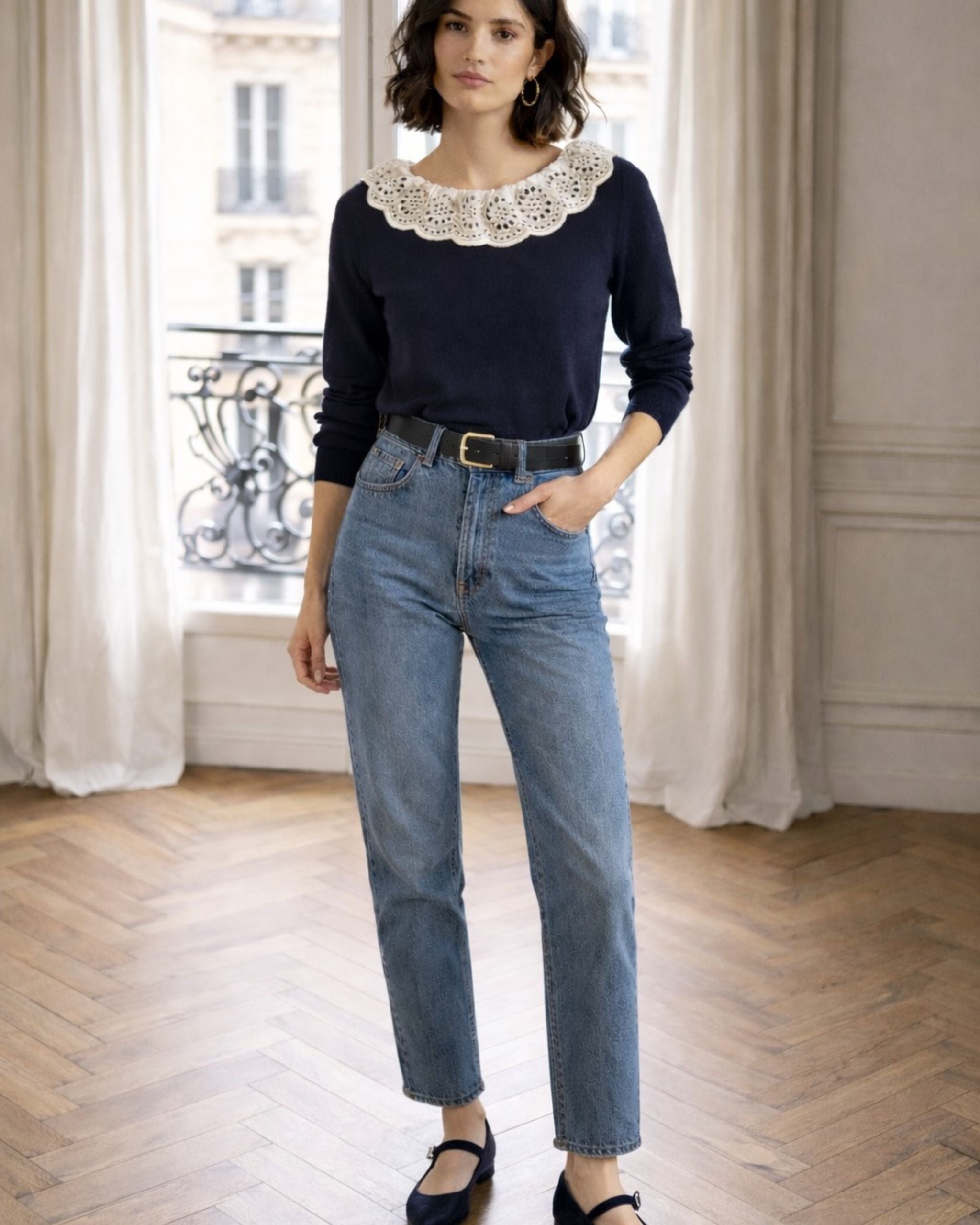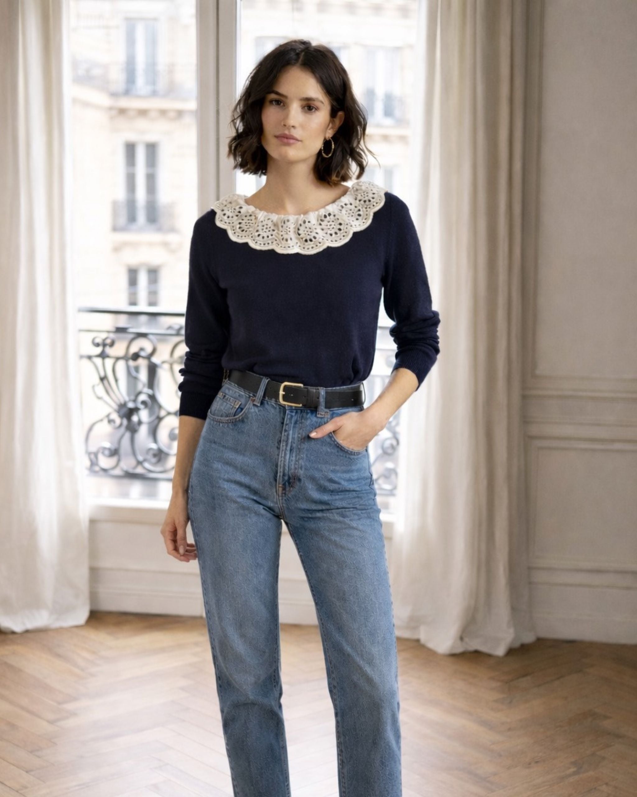 A timeless navy knit elevated with a delicate white Broderie Anglaise collar