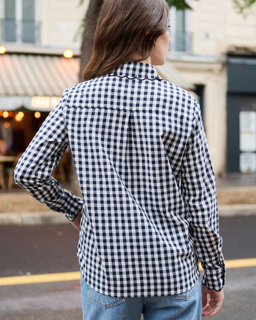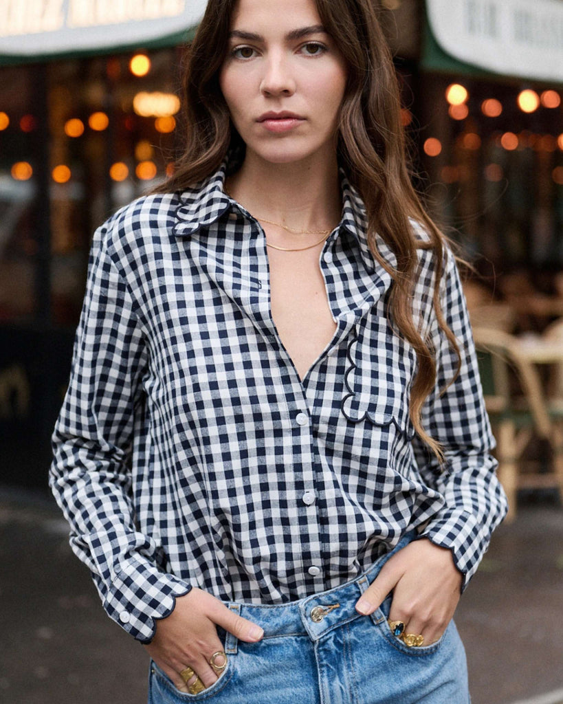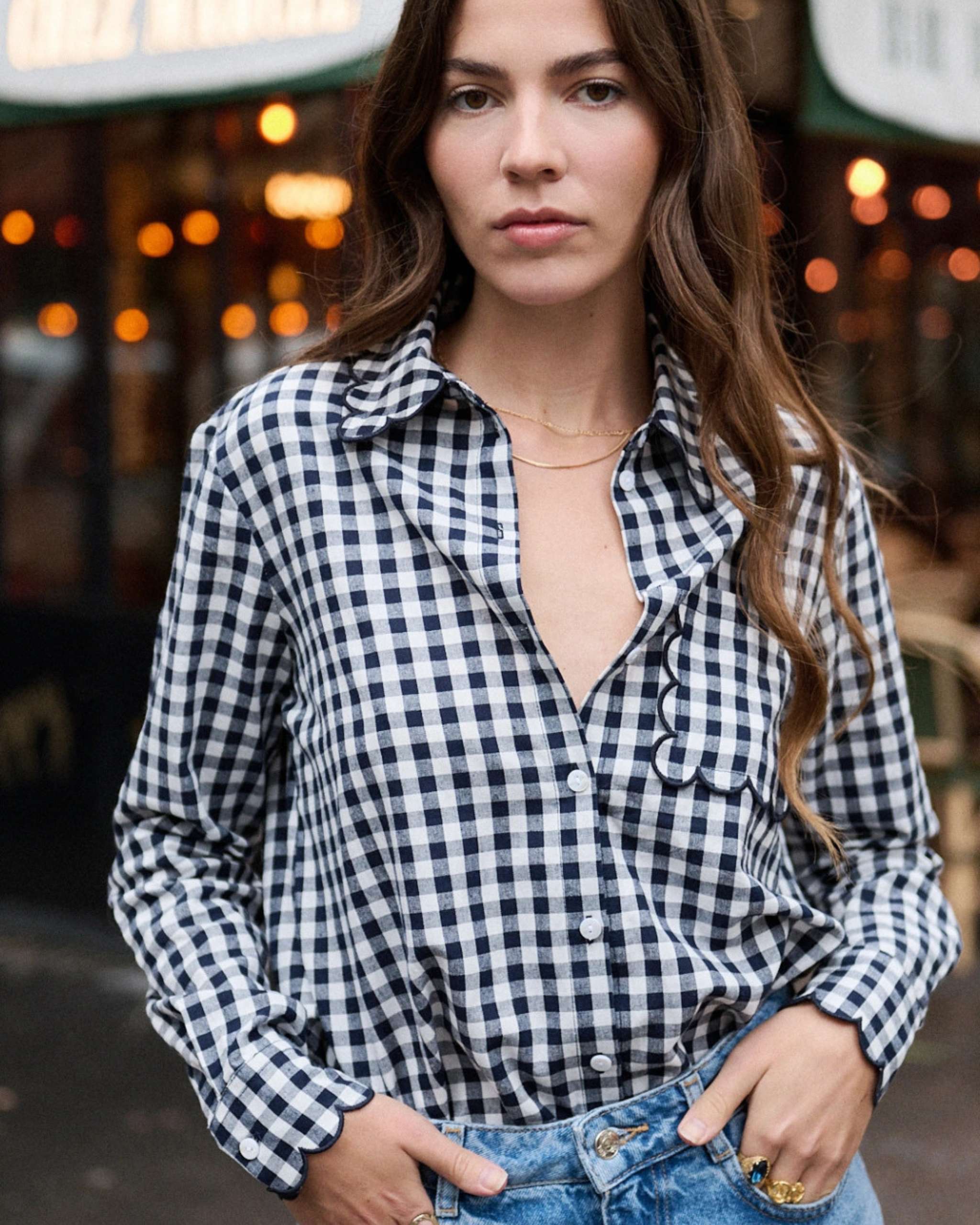 A classic Parisian style staple with a playful twist. The Marceline shirt brings a timeless French-Girl charm to your wardrobe with its navy gingham check and scallop detailing.